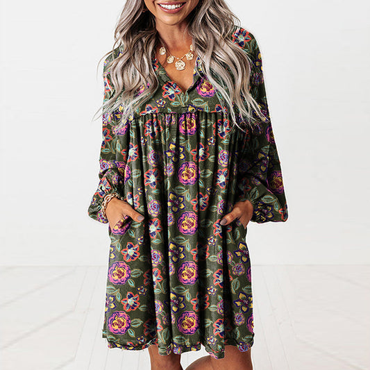 Elegant V-Neck Boho Print Dress with Effortless Charm